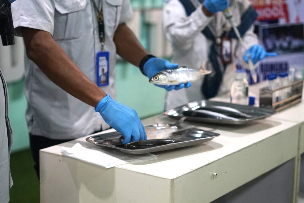 Setelah sesi materi, acara dilanjutkan dengan demonstrasi penelitian formalin pada ikan segar yang dipandu oleh tim analisis kimia laboratorium BPPMHKP Surabaya II.